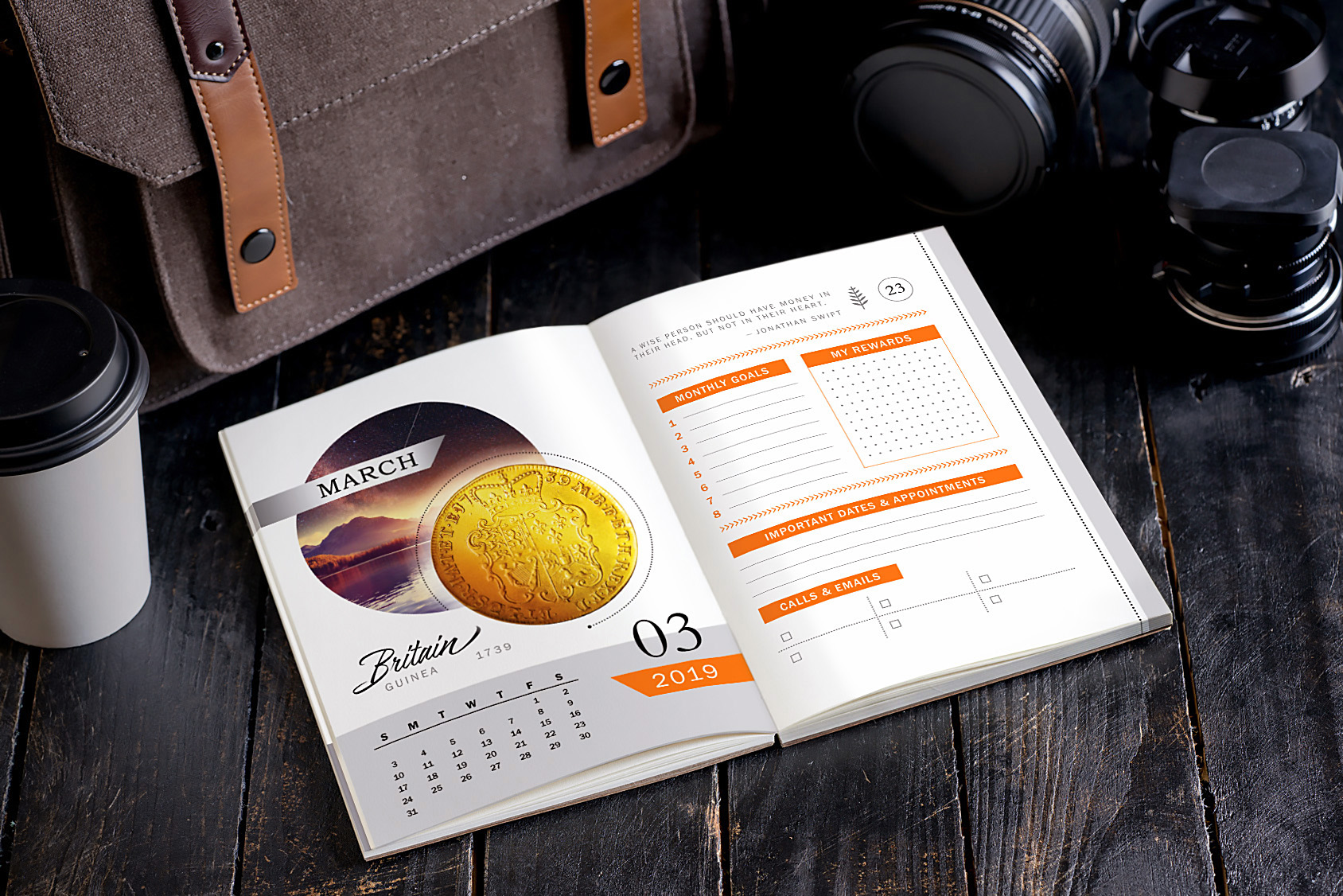 In the digital era, new cryptocurrencies become more and more popular across the globe. However, crypto coins will never look as beautiful as antique thalers or krones. Vintage European coins get a modern twist in this carefully designed self-promotional project, which includes a wall calendar, a 12-month planner, and a stylish tote bag.