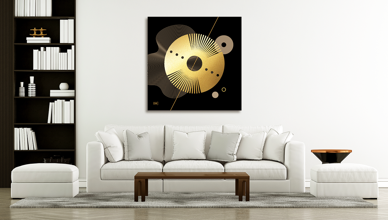 This modern art composition represents the essence of life, which emerges from chaos and darkness. Inspired by mysterious jade discs from Neolithic China (33,000 – 22,000 BCE), this abstract artwork is perfectly balanced and reflects the traditional belief that gold is associated with power, wealth, longevity, and happiness. It also illustrates the ancient people’s concept of the universe: the sky is round, and the earth is square.