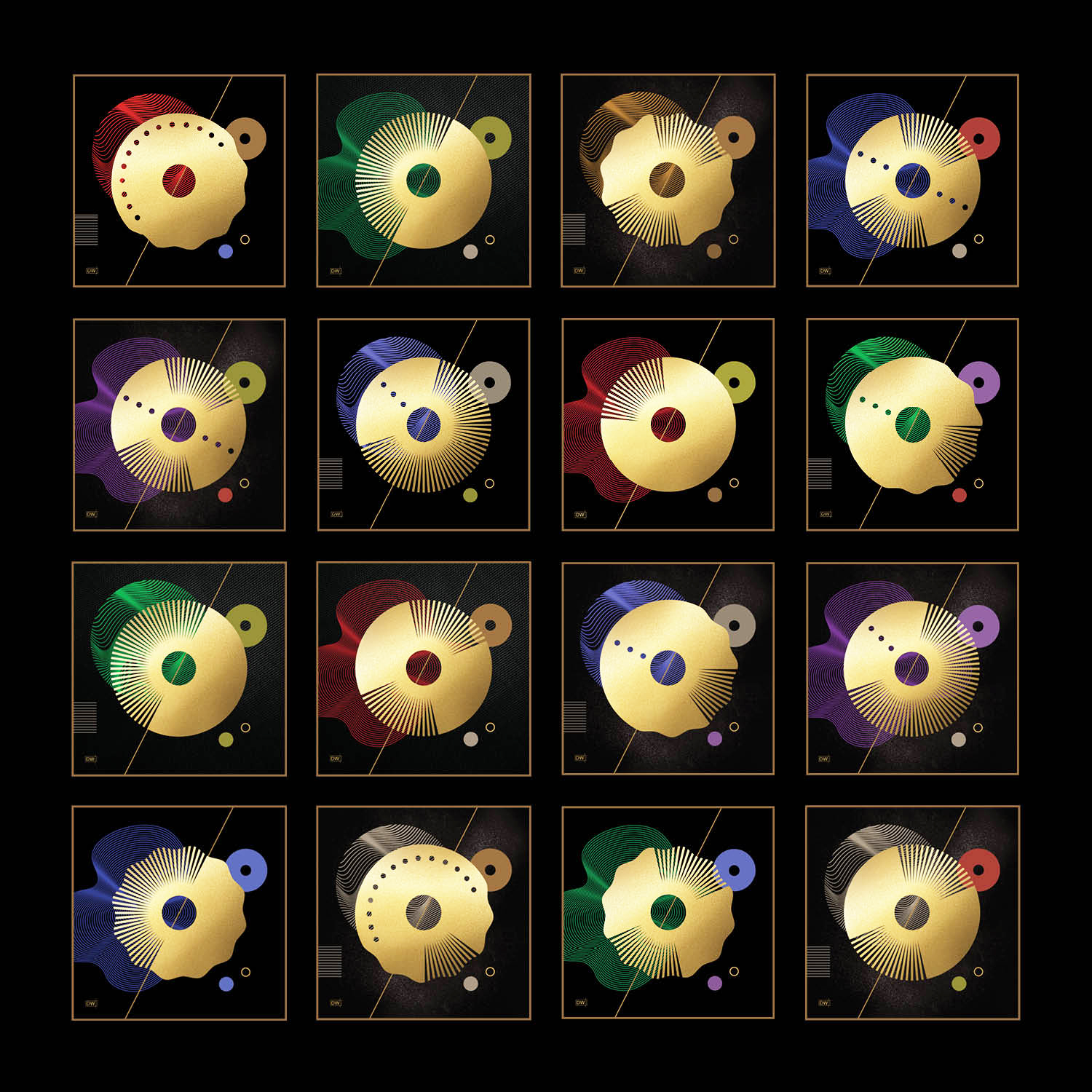 Dynamic NFTs are digital artworks produced by smart contracts and stored on a blockchain. Any of the 20,000+ editions can be created by running an algorithm with a set of preprogrammed rules. The generated artworks are built from 40 unique graphic objects and backgrounds created by Dasha Wagner. Using the artist’s criteria, the computer then produces a final art piece by randomly combining these elements into a balanced composition.